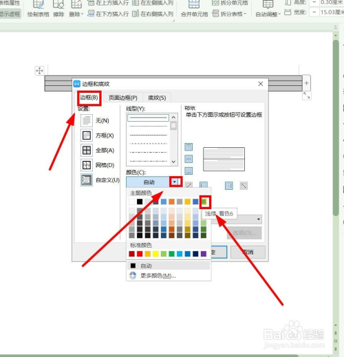 在“边框和底纹”对话框,选择“边框”选项卡,颜色选择“浅绿色”单击