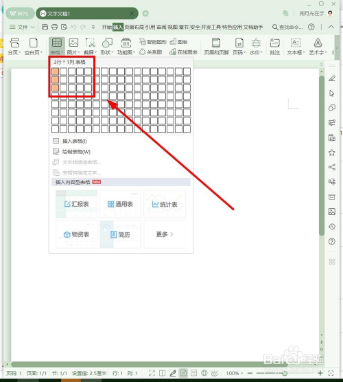 单击“表格”中的“表格”,鄙人拉菜单中,选择表格为1x3,也就是1列3行。