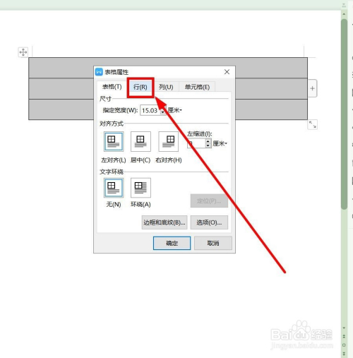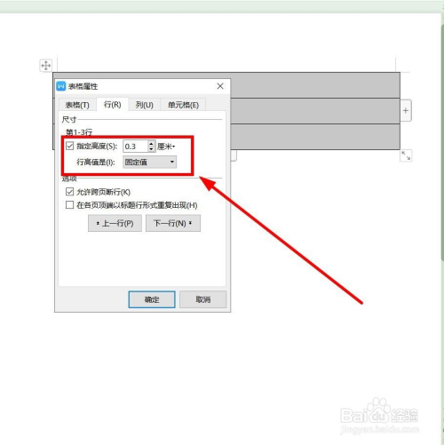 在表格属性对话框,选择“行”选项卡单击