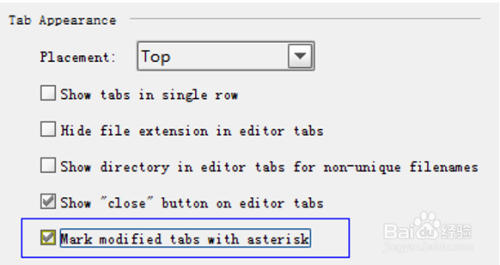 同时点窜未保留的显示星号,打开 Settings-Editor->Editor Tabs, 勾上“Mark modified tabs with asterisk”,如下图所示: