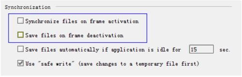 封闭主动保留,打开 Settings-General,反选“Synchronize file on frame activation”和“Save files on frame deactivation”,如下图所示: