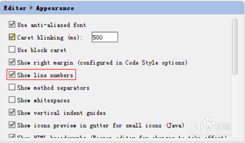 显示行号,打开 Settings->Editor->Appearance,勾上“Show line numbers”,如下图所示: