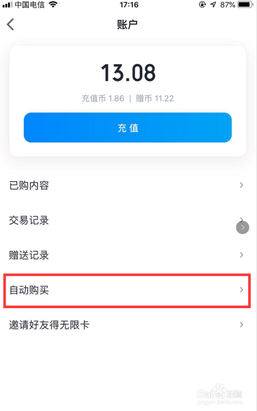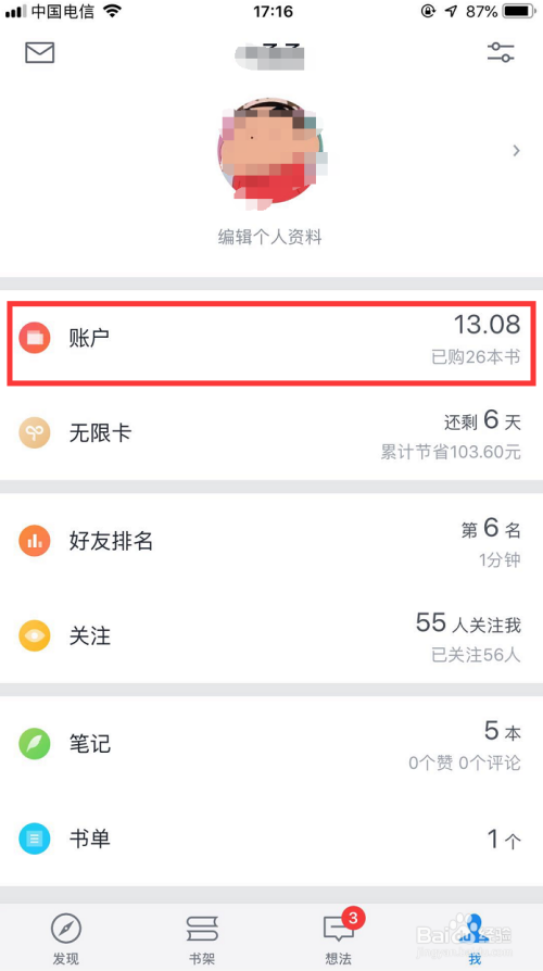 在我的本家儿页下,有一个【账户】栏,如图所示,点击该栏,进入账户本家儿页!