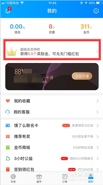 在我的本家儿页下,找到【超等会员特权】一栏,如图所示,点击进入该栏,查看超等会员特权!