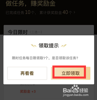 点击领使命后,屏幕上还会弹出一个领取提醒,点击金色的【当即领取】即可,如图所示!领取后按要求完当作使命,就可获得响应的奖励金。每5个奖励金可以兑换5元无门槛红包哦!