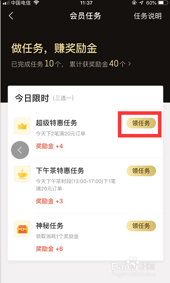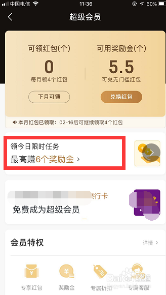在超等会员本家儿页下,找到【领今日限时使命,最高赚6个奖励金】一栏,如图所示,点击进入该栏!
