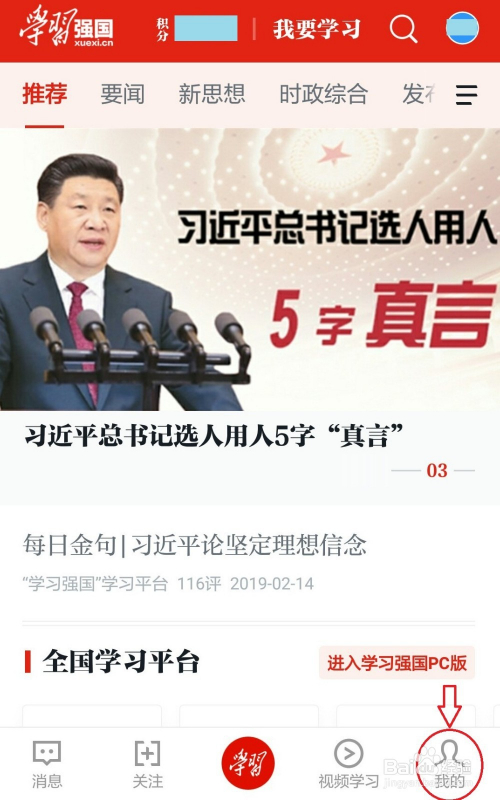 第一步:在学习强国本家儿界面,单击右下角“我的”。