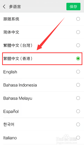 在这个页面,你将会看到各类说话供你选择,你会看到有个繁体中文(喷鼻港),点击保留就设置好了,如图所示