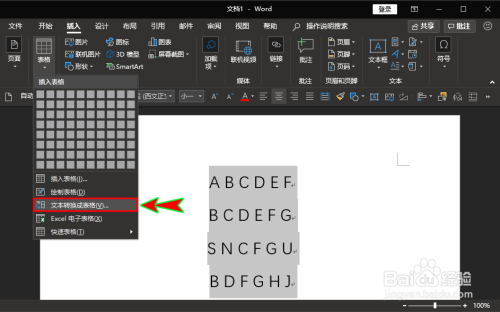 接着在“表格”的下拉菜单中选择“文本转换为表格”选项,点击之后就会弹出“将文字转换当作表格”的弹窗。