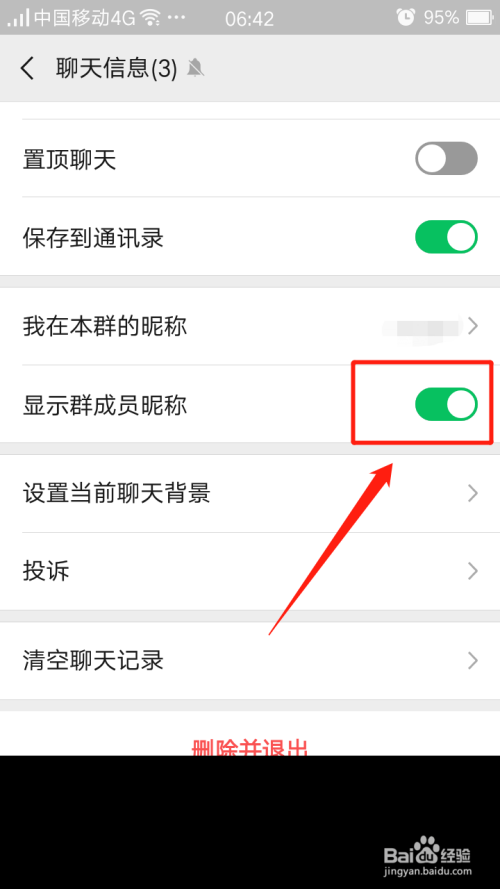 点击【显示群当作员昵称】选项右侧的按钮,按钮变绿色,【显示群当作员昵称】功能已打开。
