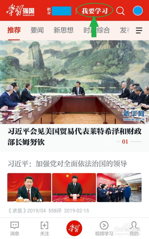 第一步:在学习强国本家儿界面,点击上方的“我要进修”。