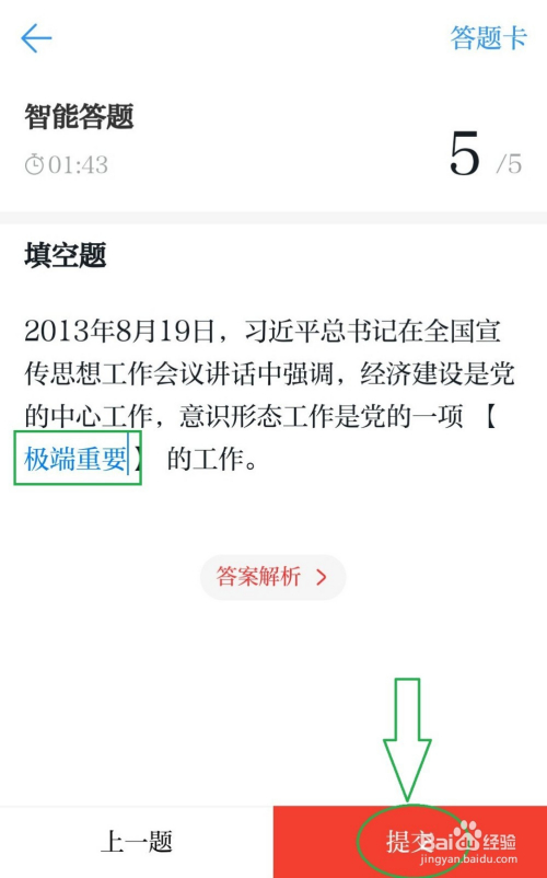 第八步:完当作5道标题问题后,若是没有问题直接点击“提交”按钮,若是前面的标题问题有问题,可以点击右上角的“答题卡”,选择响应的题号进行点窜。