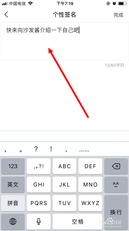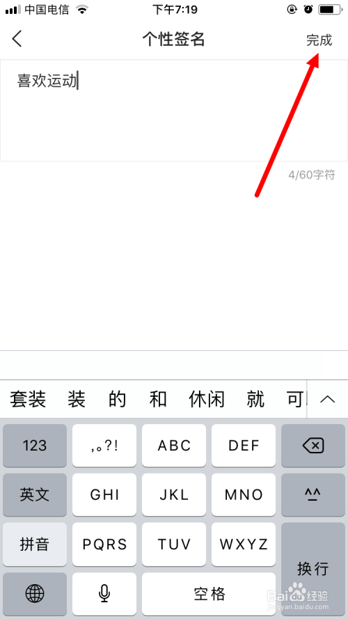 写好后,点击右上角的 完当作 。需要注重的是,个性签名的字数需要节制在60个字符之内。
