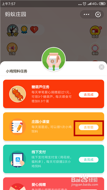接下来在领饲料使命中点击庄园小讲堂的【去答题】。