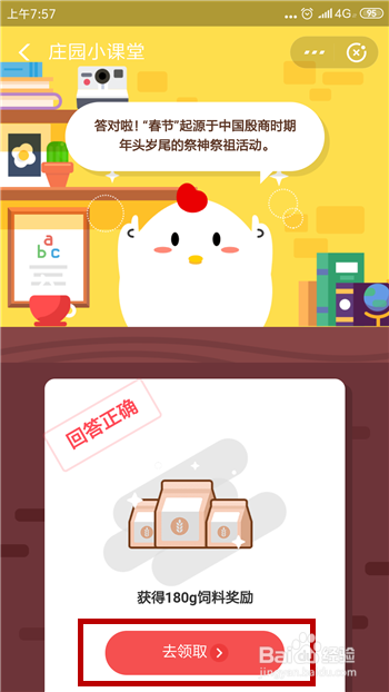 点击之后就能准确回覆问题了,点击【去领取】即可获得答题饲料。