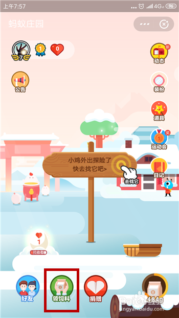 进入到蚂蚁庄园应用后找到并点击底部的【领饲料】使命。