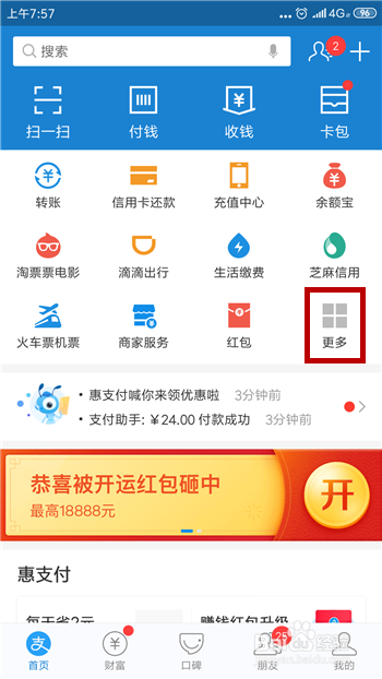 打开付出宝后找到顶部应用里的【更多】,点击打开应用界面。