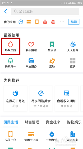 在应用界面里找到比来利用里的【蚂蚁庄园】并点击打开。