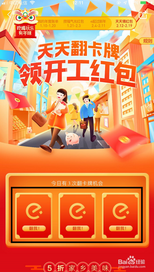 点击后进入领开工红包本家儿页,将本家儿页下3张卡牌一一点开领取响应红包,如图所示!