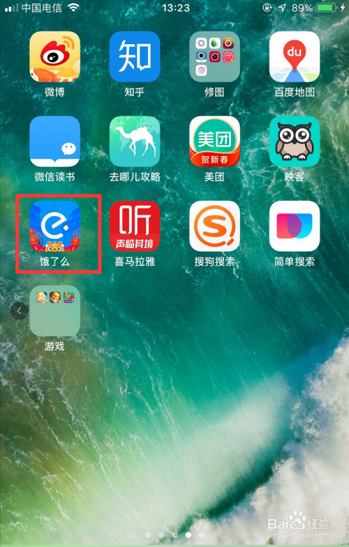 打开手机,在屏幕上找到【饿了么】APP,如图所示,点击登岸,进入饿了么首页!