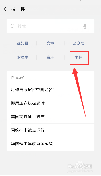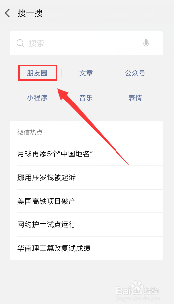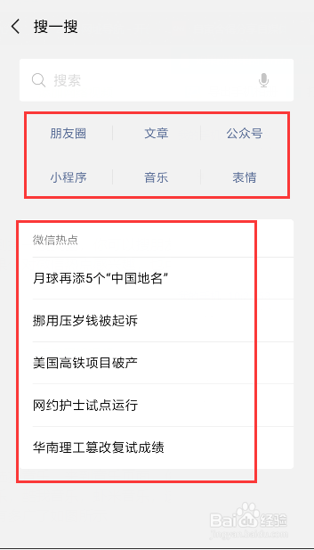 点击搜一搜,来到搜一搜页面,你可以搜朋友圈,文章,公家号,音乐,小程序,脸色等,若是你对微信热点感乐趣,也可以点击系统保举的热点,如图所示