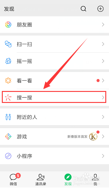 在发现的界面,你就会看到有个搜一搜的选项,如图所示