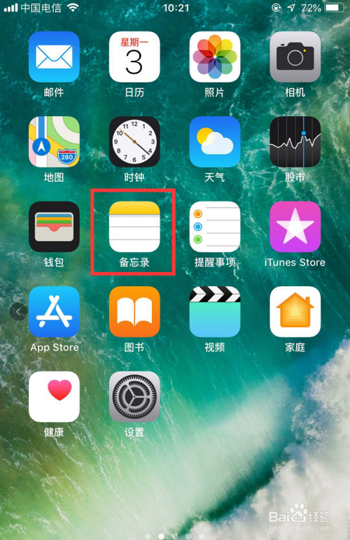 打开苹果手机,在屏幕上找出苹果自带的【备忘录】APP,如图所示,点进备忘录APP!