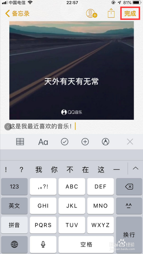 点了完当作后,视频就被添加到了备忘录中,此时还可以在备忘录中添加一些文字描述,编纂完当作后点击备忘录右上角的【完当作】,如图所示!