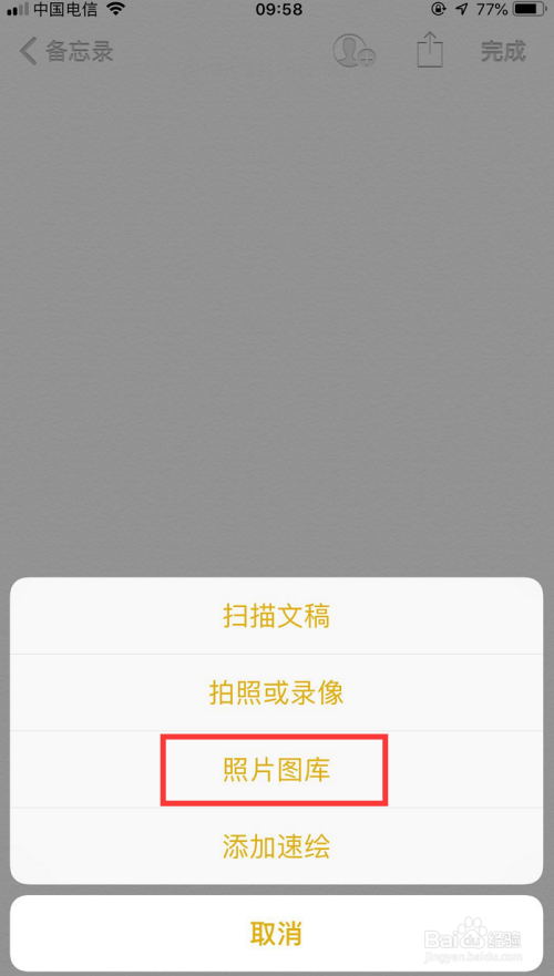 点击后,在页面下方弹出的选项中点击【照片图库】,如图所示!