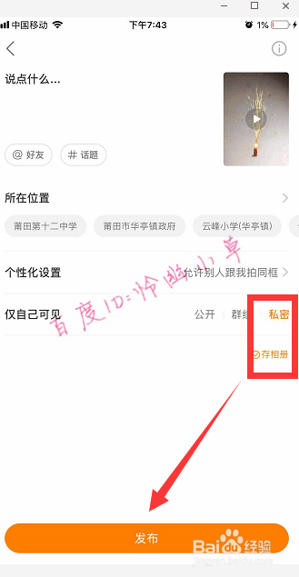 存相册后发布,也可以选择奥秘发布,然后把视频传至抖音。