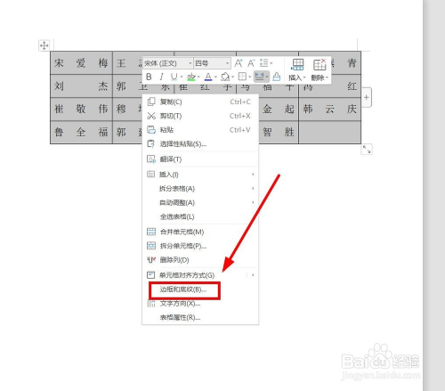 选中表格,鼠标右键,在右键菜单找到“边框和底纹”单击