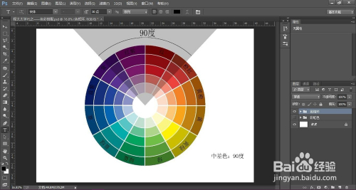 中差色:色相环中相距90度的颜色,为中差色关系。