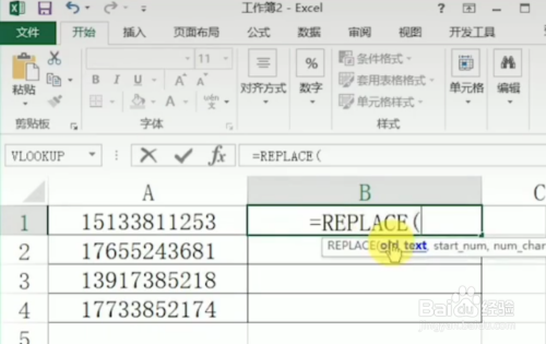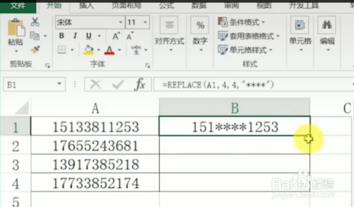 第二步:在空白单位格中输入替代函数公式=REPLACE(A1,4,4,”####“)。