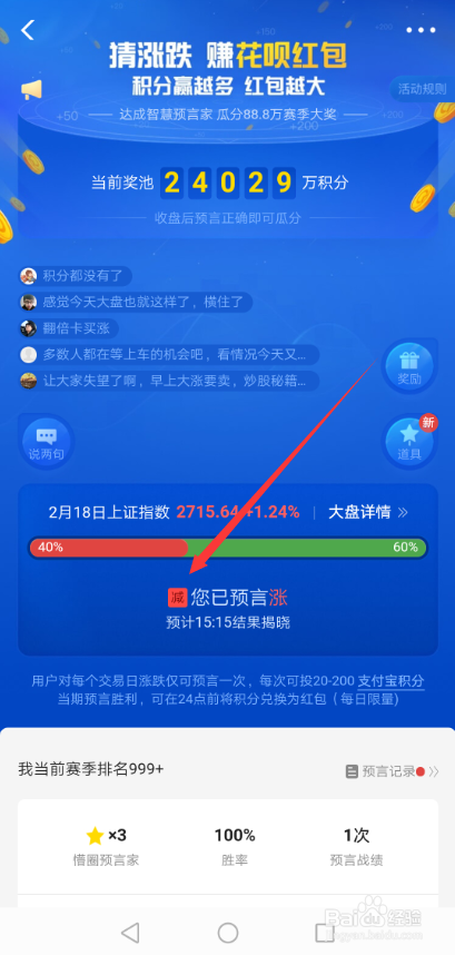 预言当作功后,在付出宝猜涨跌界面里就可以看到已预言前面有个【减】,如下图所示。