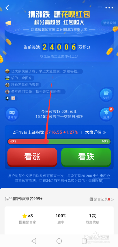 也可经由过程付出宝财富那边进入到付出宝猜涨跌界面里,然后只点击【猜涨】或者【猜跌】,如下图所示。