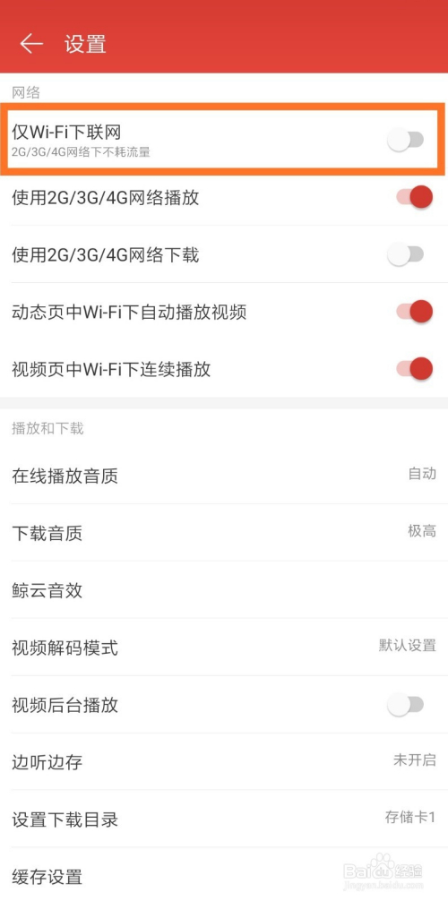 找到“仅WiFi下联网”一栏,点击按钮将其打开。此时,网易云音乐就只能在有WiFi的时辰联网,而不会利用手机流量;