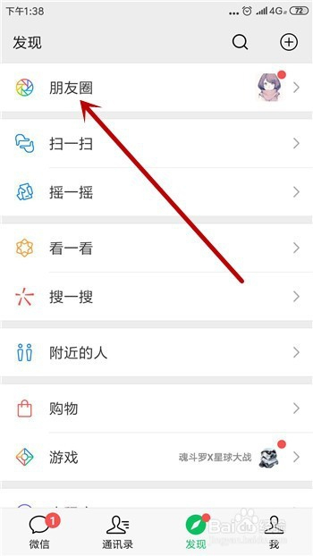 为了证实分享当作功,打开微信后点击【朋友圈】。