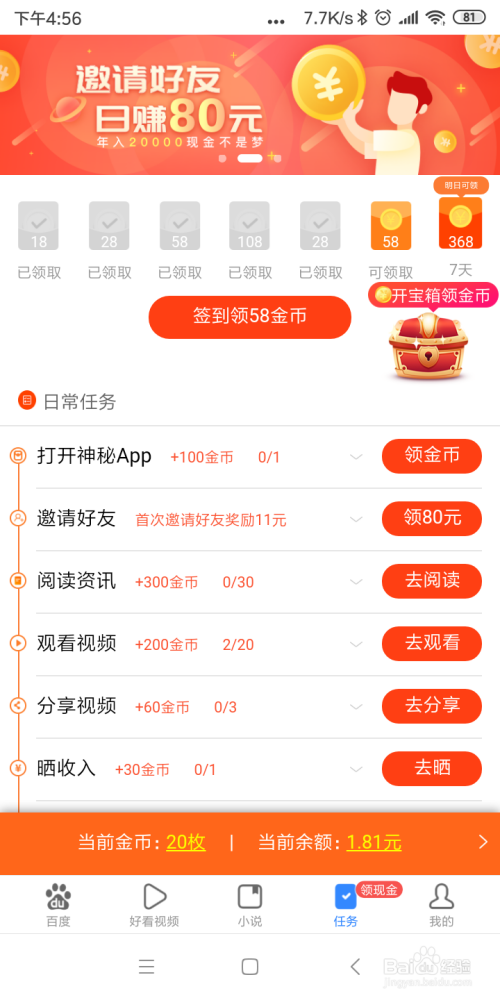 进入活动页面后,可以看到日常使命,内容有良多,并且都可以赚取金币,金币可以换取现金,100金币=1元