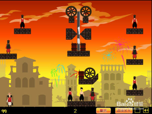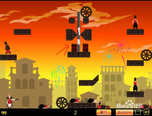 匪情阐发。此关中心两处有弹药且最上方有轮子。射击过程中,需要小心弹药爆炸及轮子飞落误伤本身。