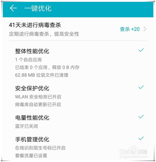 其次,可以进入手机管家,点击“一键优化”按钮,操纵该功能来优化系统设置,让手机运行在最佳设置下。
