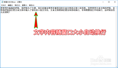 当我们开启文本文档的主动换行功能后,今后当我们再新建文本文档程序时,输入文字后里面的文字城市主动换行,并且城市跟着程序窗口的大小转变。