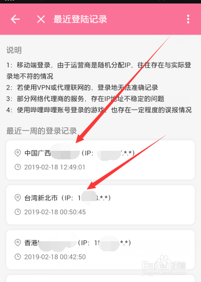 最后我们就可以看到本身B站账号号登录过的时候,地址,设备的IP地址等记实