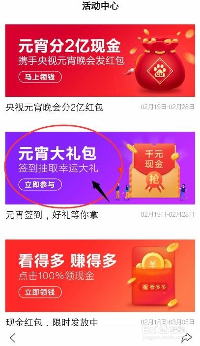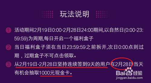 从2月19日~2月28日持续签到9天的人,可以在2月28日当天抽取1000元现金卡。