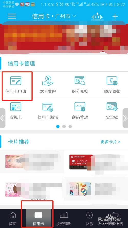 第二步,进入应用之后,点击信用卡,然后往下拉一点点,接着点击信用卡申请,如图所示。