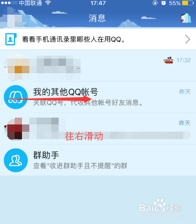 进入手机QQ后,我们要在聊天界面往右滑动,呼出侧边栏,如下图箭头所示