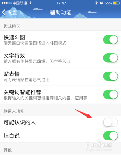 进入辅助功能后,我们找到可能熟悉的人选项,将该选项的开关按钮封闭就好了,如下图所示