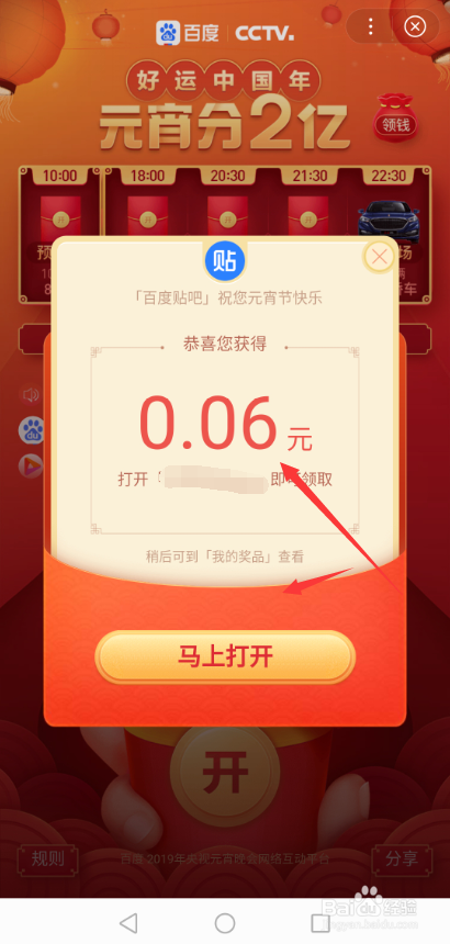 点击后百度APP就会弹出抽奖成果了,这样就可以看到元宵节抽取红包金额了,如下图所示。