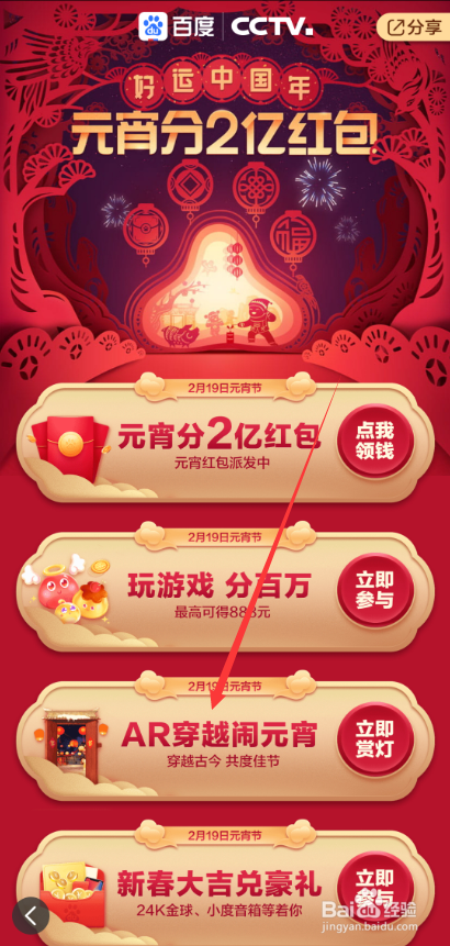 然后在百度元宵分2亿红包界面里直接点击下面的【百度AR穿越闹元宵】选项,如下图所示。