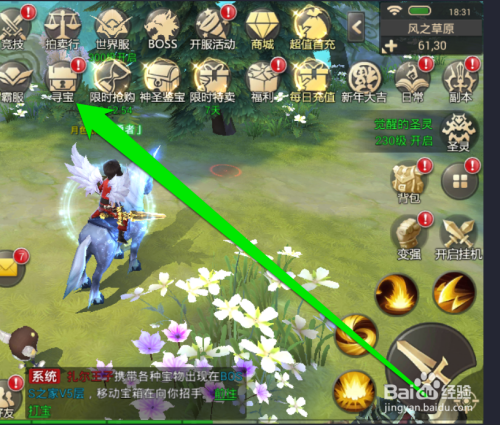 启动游戏,进入游戏后,点击寻宝的按钮。
