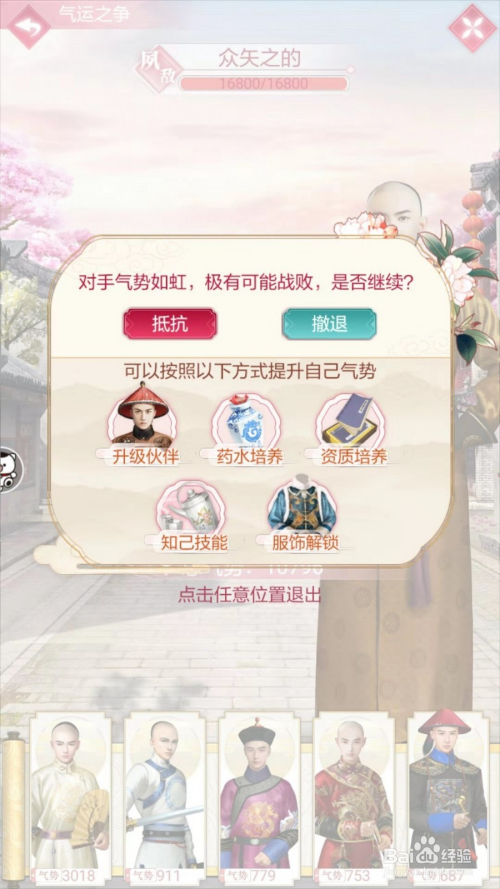 第三步:在和夙敌匹敌界面,我们可以看到夙敌的气焰和本身的气焰,若是本身的气焰值高于夙敌,就是稳稳的通关了,若是低于夙敌,就需要用元宝恢复我方气焰最高的伙伴。